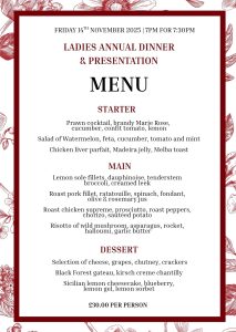 On Friday 14th November we have the Ladies Annual Dinner and Prize Presentation, If you would like to attend please put your name down on the sign-up sheet which is located on the ladies notice board before Friday 7th November